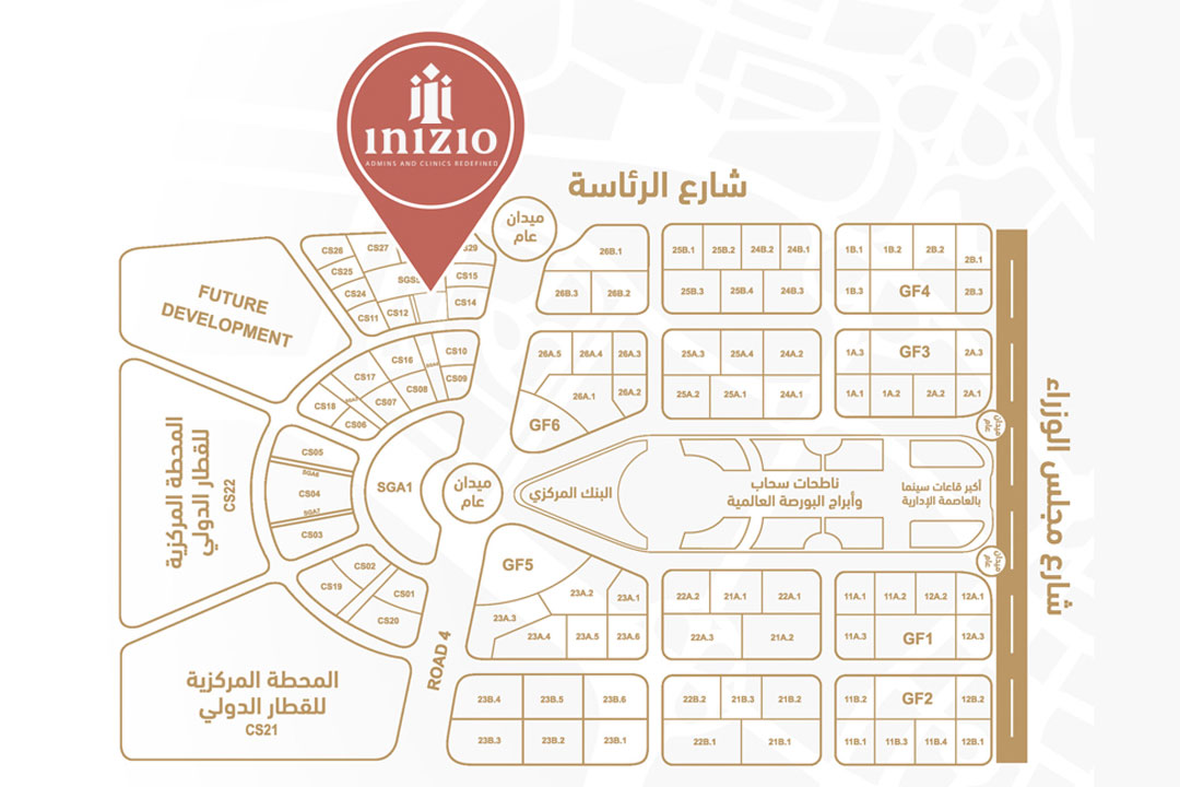 يقع مشروع Inizio أمام شارع الرئاسة مباشرة و يطل علي البنك المركزي و عدد من مقرات البنوك و فندق الماسة و يطل علي حديقة كبيرة علي مساحة 5000 متر.